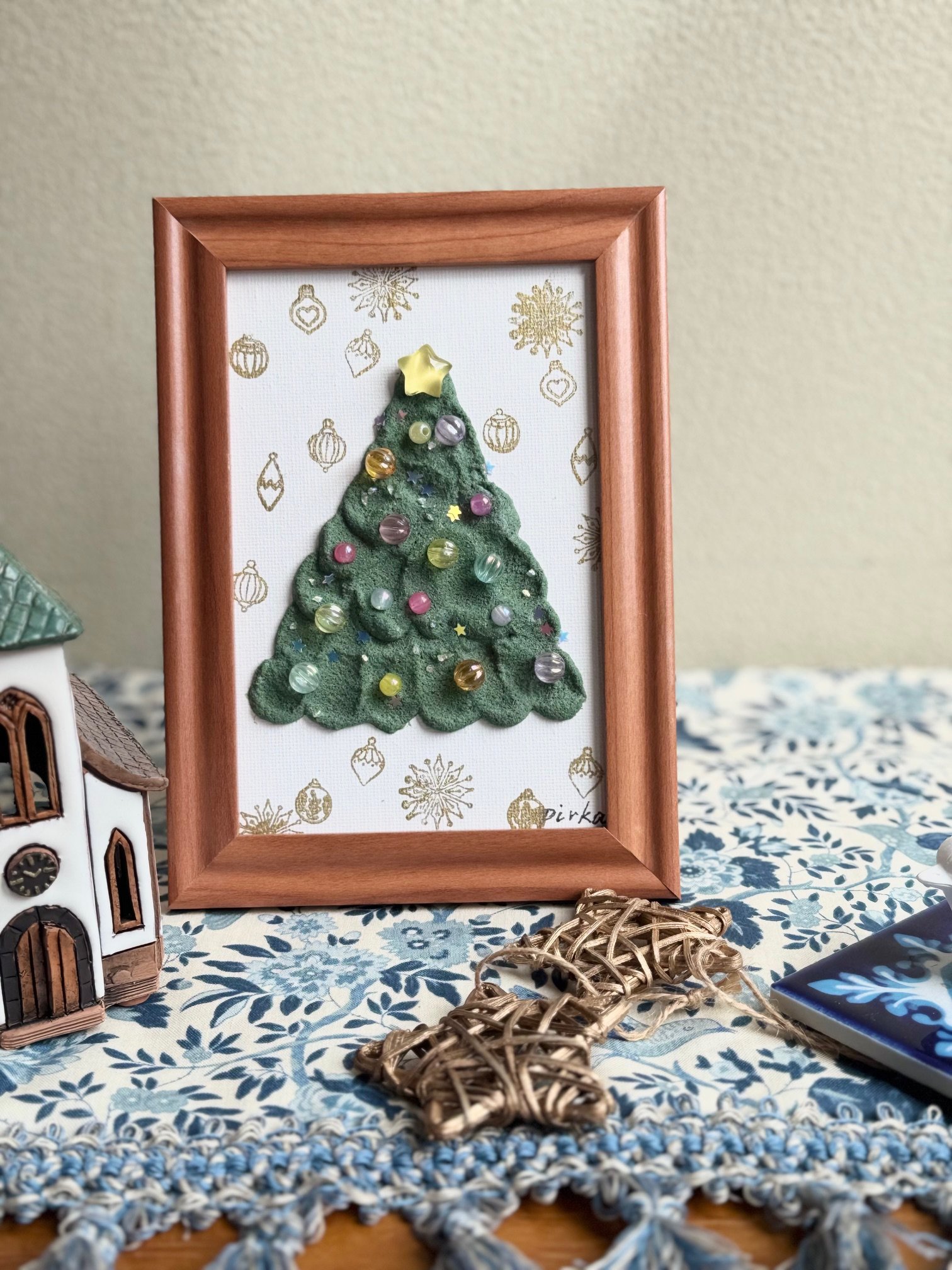 キャンバス地にツリーを作ってお好きな飾りつけをしていただきます。お子様でも簡単にできますよ♪