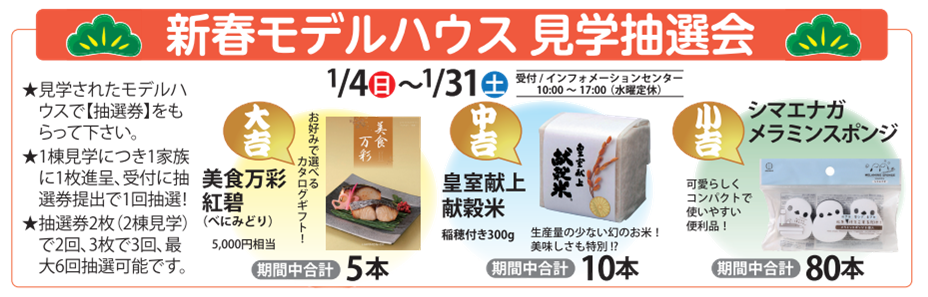 期間中、お気に入りのモデルハウスを1棟見学すると抽選券が1枚貰えて、ステキな賞品が当たる抽選会に最大6回ご参加いただけます。 (抽選券1枚につき、1回の抽選です)