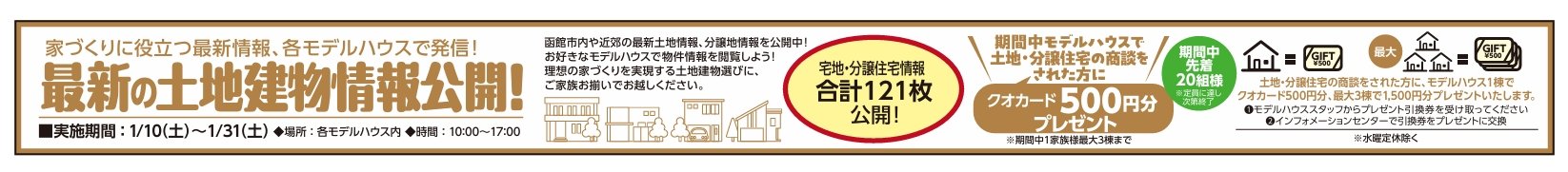 期間中モデルハウスで土地・分譲住宅のご商談をされた方にクオカード500円分プレゼント!