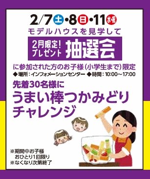 2月7日(土)・2月8日(日)・2月11日(水祝)の3日間、会場内A・B2つの各ブロック見学を含むモデルハウス3棟以上のご見学された方には 商品券やお菓子が当たる?! お楽しみガチャガチャ抽選会 に参加できます!