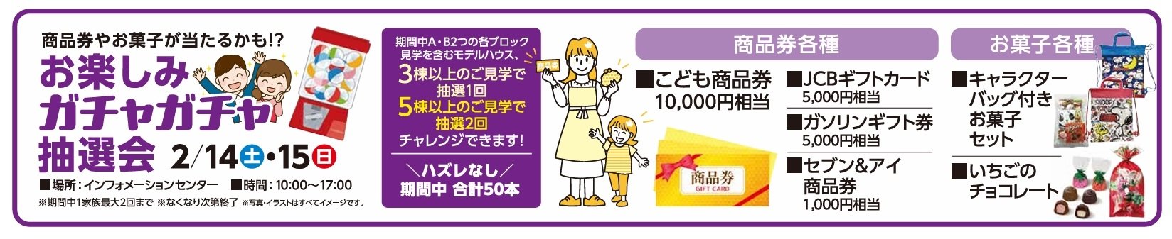 2月14日(土)・2月15日(日)に会場内A・B2つの各ブロック見学を含むモデルハウス3棟以上のご見学された方には 商品券やお菓子が当たる?! お楽しみガチャガチャ抽選会 に参加できます!