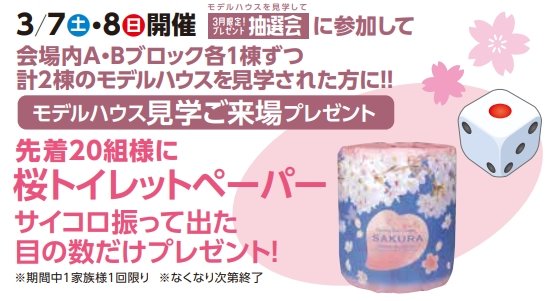 3月7日(土)・3月8日(日)に会場内A・Bブロック各1棟ずつ計2棟のモデルハウスを見学された方は 薬桜トイレットペーパー サイコロ振って出た目の数だけプレゼント! に参加できます!