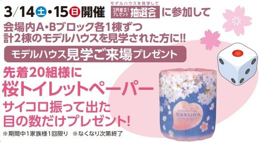 3月14日(土)・3月15日(日)に会場内A・Bブロック各1棟ずつ計2棟のモデルハウスを見学された方は 薬桜トイレットペーパー サイコロ振って出た目の数だけプレゼント! に参加できます!