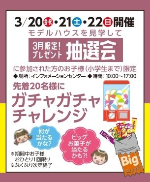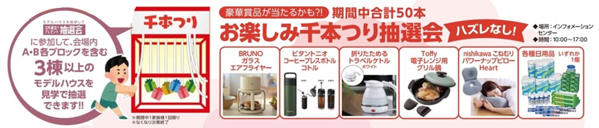 3月20日(金祝)・3月21日(土)・3月22日(日)に会場内A・B各ブロックを含む3棟以上のモデルハウスを見学された方は 薬豪華賞品が当たるかも?! お楽しみ千本つり抽選会 に参加できます!